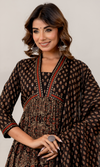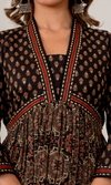 Black Semi Cotton Printed Anarkali Suit, a blend of elegance and comfort. Featuring a flattering V-neckline, 3/4th sleeves, and a practical pocket, this set includes a semi-cotton top and dupatta paired with a cotton blend bottom. Perfect for casual outings or light festivities, its timeless printed design ensures effortless style.