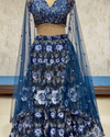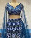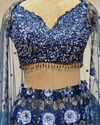 Sparkle in our blue sequin-top lehenga set: an intricately embroidered sequin blouse paired with a floral-sequin lehenga and airy net dupatta. Deep ocean blue hues lend regal charm while the shimmer and floral motifs evoke romance — perfect for weddings, cocktail evenings, and festive celebrations