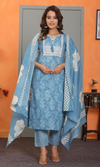 Elevate your ethnic style with this Blue Semi Cotton Embroidered Salwar Suit, featuring a classic round neckline, half sleeves, and a handy pocket. Made from breathable semi cotton, this elegant set includes matching bottom and dupatta—perfect for festive occasions, casual wear, and modern traditional looks.