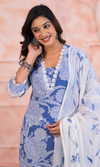 Enhance your ethnic wardrobe with this Blue Semi Cotton Floral Printed Salwar Suit, featuring a trendy V-neck, 3/4th sleeves, and a practical pocket. Crafted from breathable semi cotton, this three-piece set with matching dupatta is perfect for festive occasions, office wear, and everyday comfort.