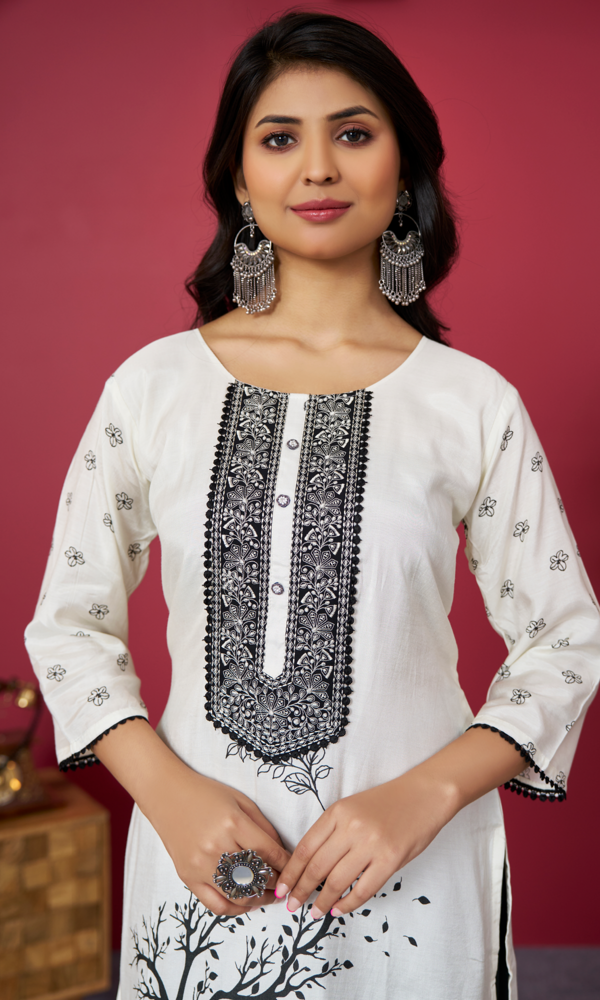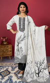 Embrace timeless elegance with this cream semi cotton embroidered salwar suit in classic black, featuring a round neckline and 3/4th sleeves. The set includes a matching dupatta, blending comfort and sophistication—perfect for festive occasions, parties, or everyday chic.