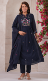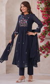 Elevate your ethnic style with this navy blue semi-cotton suit set featuring trendy floral embroidery. The set includes a comfortable round-neck 3/4th sleeve top, matching bottom, and a chic dupatta—perfect for festive occasions and daily wear. Embrace elegance and effortless comfort with this must-have wardrobe essential.