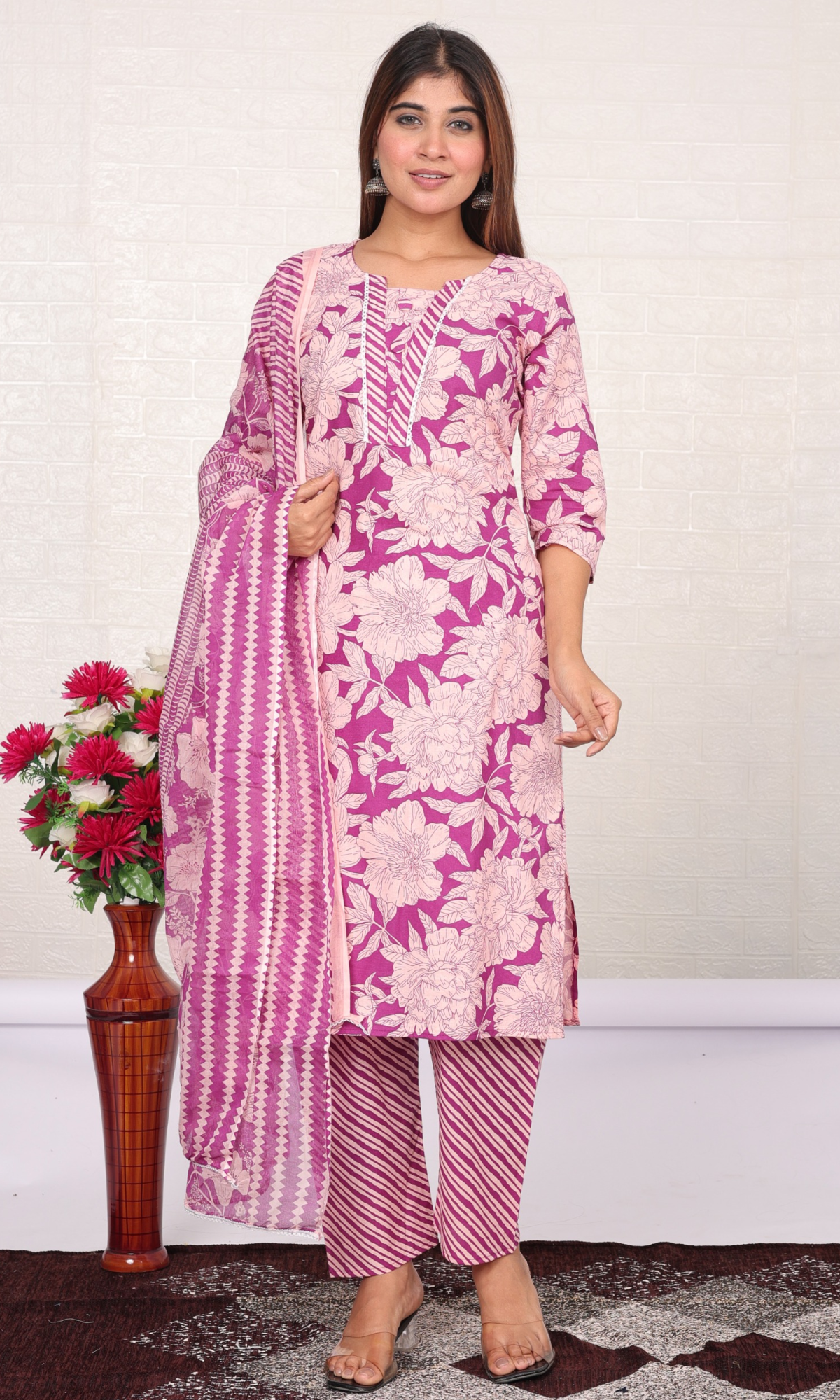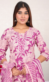 Step out in style with this Purple Semi Cotton Floral Printed Salwar Suit, featuring a round neckline, half sleeves, and a convenient pocket. This lightweight, trendy set with a matching dupatta is perfect for festive wear, office outfits, and everyday ethnic elegance.